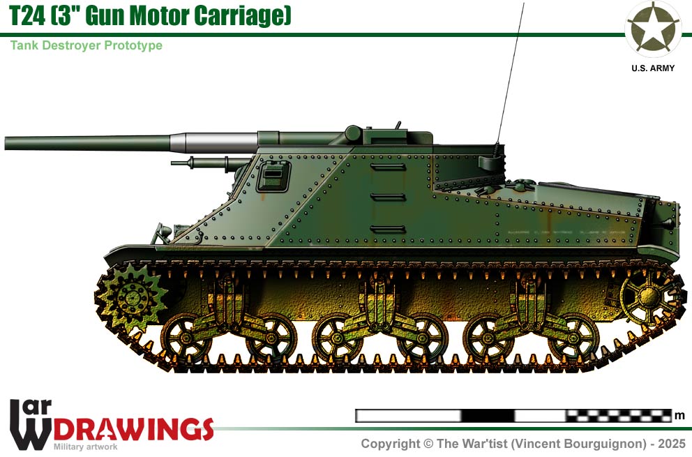 The M3 hull was used as the basis for a tank destroyer mounting the 3-inch gun, a reworked World War-era weapon - by removing the turret, sponson gun and hull roof. It was developed in September 1941 but in tests the resulting vehicle was judged to be too tall and the gun mount was not suitable for mass production so the T24 project was cancelled in 1942; |