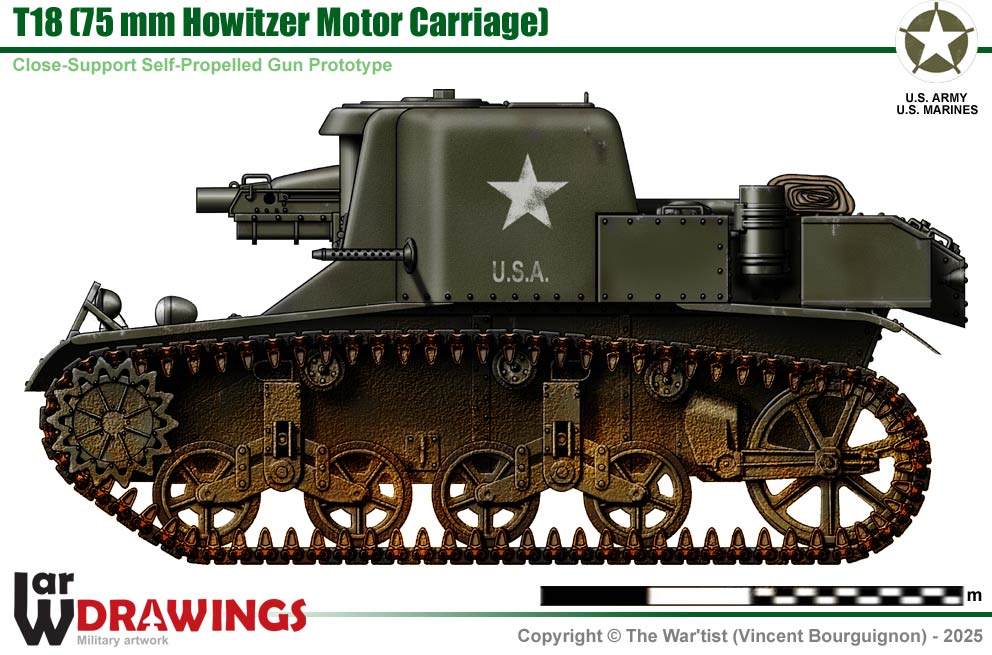 Its development started in September 1941 as a close-support vehicle using the M3 Stuart's chassis. A 75 mm howitzer was mounted on the right front of the vehicle, but was abandoned in 1942. Two prototypes were produced, |