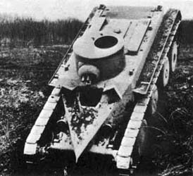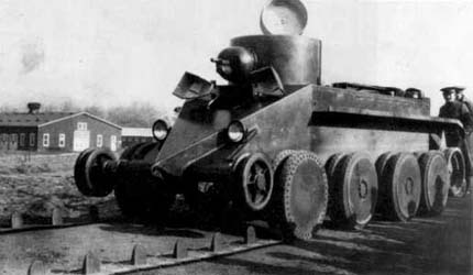 BT (Bystrochodia Takhn) Tanks Genesis La mission technique soviétique envoyée à l' étranger en 1929 fut très impressionnée par les nouveaux chars rapides et convertibles construits aux USA par J. Walter Christie. Ces chars munis de puissants moteurs d' avion pouvaient à la fois évoluer avec ou sans chenilles, pouvaient atteindre une vitesse maximale de 63 km/h sur chenilles et de plus de 100 km/h sur roues et parcourir 230 km sans ravitaillement. Ce type de char convenait parfaitement aux missions dévolues aux chars BT (rapides) des formations mécanisées DD (à grand rayon d' action) qui étaient chargées des opérations autonomes de pénétration profonde. Deux chars Christie furent achetés par l' Union soviétique. The Soviet technical mission sent abroad in 1929 was very impressed by the new fast and convertible tanks built in the USA by J Walter Christie. These tanks provided with powerful engines of plane could at the same time move with or without tracks, could reach a maximum speed of 63 km/h crawler-mounted and more than 100 km/h on wheels and traverse 230 km without supply. This type of tank was appropriate perfectly for the missions reserved for tanks BT (rapids) of the mechanized formations DD (with large operating range) which were in charge of the autonomous operations of deep penetration. Two Christie tanks were bought by the Soviet Union.