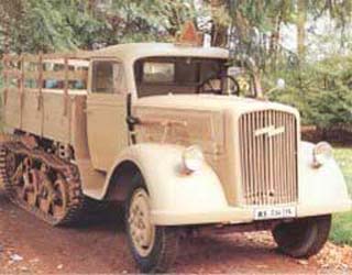 Zugkraftwagen (Prime Movers) Sd.Kfz.3a/b/c Gleiskettenlastkraftwagen 2t offen "Maultier"Pour approvisionner en munitions, en carburant et autres fournitures, les troupes engagées sur les terrains en mauvais état du front oriental, des camions 4x2 standards de 3 tonnes (Opel (3a)/Ford (3b)/Klockner-Humbolt-Deuts (3c) et Mercedes) furent transformés en véhicules semi-chenillés tout terrain. Ce modèle d'intérim , fut réalisé pour pallier le retard du Schwerer Wehrmachtschlepper. Pour ce faire, le train arrière fut enlevé et remplacé par un train chenillé (type Cardan Lloyd) avec des chenilles de Pz.Kpfw I ou II (Mercedes). To supply in ammunition, fuel and other supplies, the troops engaged on the grounds in bad condition of the Eastern front, standard 4x2 trucks of 3 tons (Opel (3a)/Ford (3b)/Klockner-Humbolt-Deuts (3c) and Mercedes) was transformed into cross country half-tracked vehicle. This model of interim, was realized to palliate the delay of Schwerer Wehrmachtschlepper. With this intention, the rear wheel-axle unit was removed and replaced by a tracked train (Cardan Lloyd type) with tracks of Pz.Kpfw I or II (Mercedes).