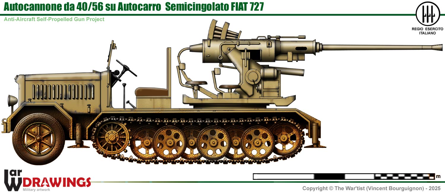 The Autocannone da 40/56 su Autocarro Semicingolato FIAT 727 was an Italian paper project that was developed on a vehicle was also merely a paper project and even armed with a main gun that was not yet in service with the Regio Esercito. |