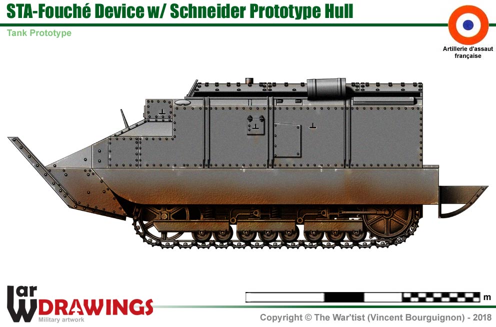 On this STA-Fouché device (track with three carriages and eight road-wheels) was mounted a mild steel dummy hull from the one drawn by Brillié.