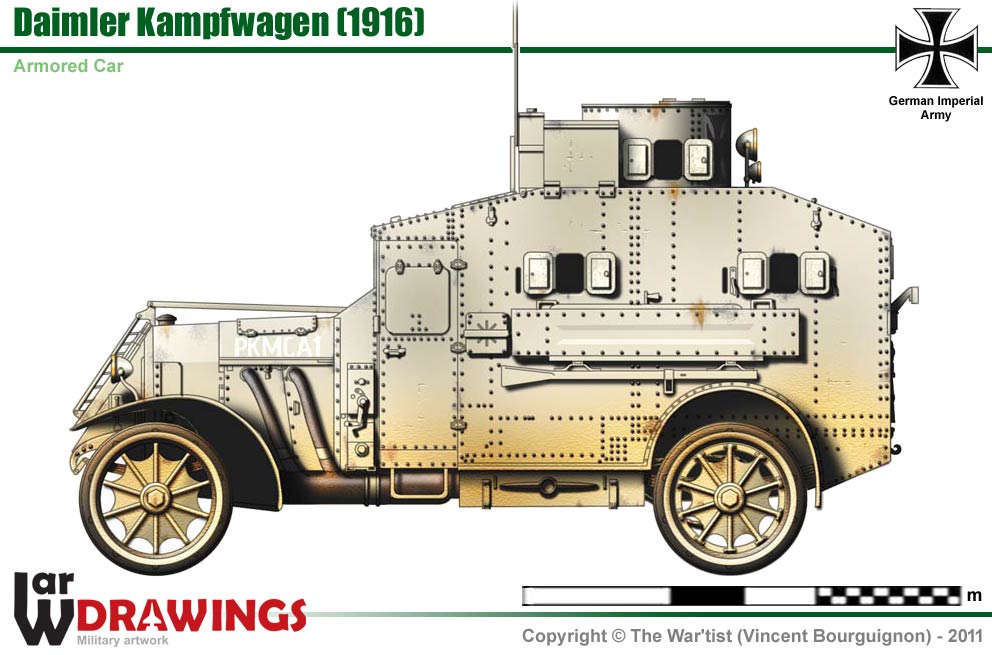 At the beginning of 1916, with this armored car was created the 1st unit of German armored cars of history which fought against the Roumanians until in 1917. The model of Daimler was a 4x4 wheeled vehicle propelled by a four-cylinder engine developing 80 hp. The gear box comprised four forward speeds and four reverse speeds . The nose gear wheels had a drum to avoid depression in soft ground. The imposing armored body was overcome by a fixed turret with four ports where four machine-guns could make fire. The hull it even was equipped with two ports on each side for the same use. |