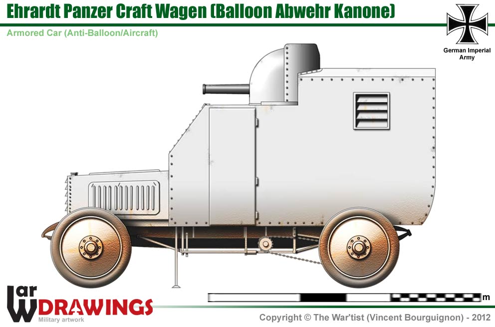 Before the First World War, the problem of aviation worried already the German high command. One thus developed a series of anti-aircraft gun-cars (BAK - Balloon-Abwehr-Kanone). The first model was Ehrardt gun-car in 1906-1907. This vehicle was built from a truck with an elaborate shielding and an anti-aircraft gun Rheinmetall of 50 mm assembled in a fixed turret in the center of the vehicle. It was intended to fight as well against the planes and airships and as against terrestrial objectives. However the models which started production were stripped of shielding. |