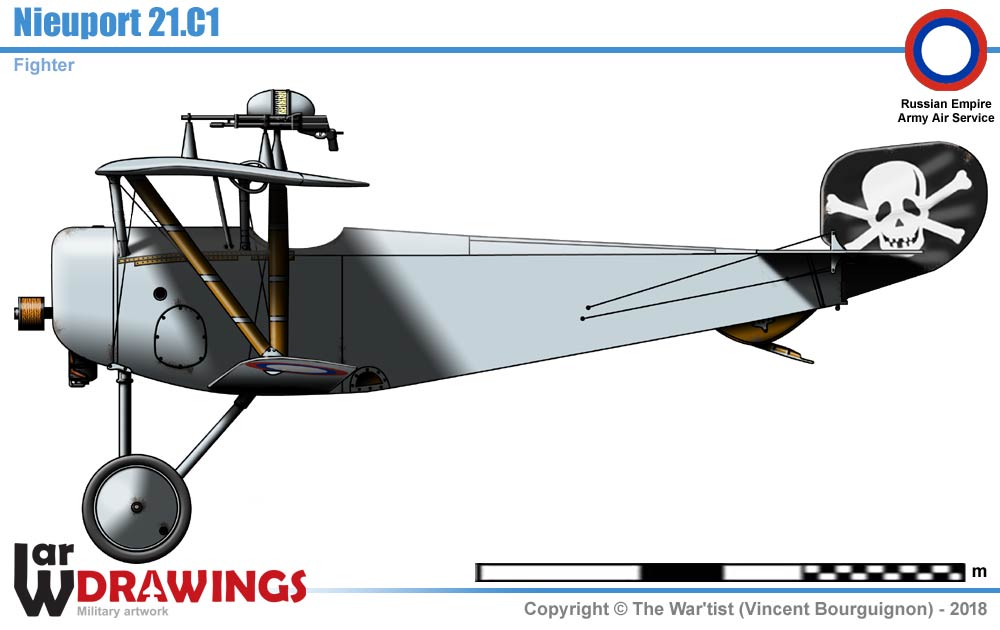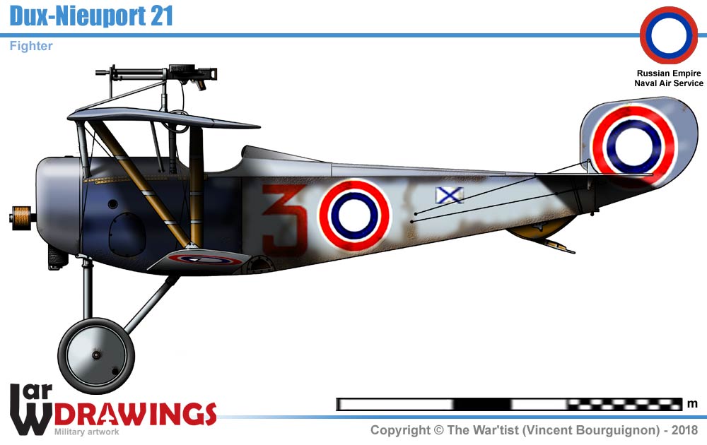 Island, August 1917. The small flag on the fuselage is the Russian naval ensign. All Navy Nieuport 21's were trainers. |