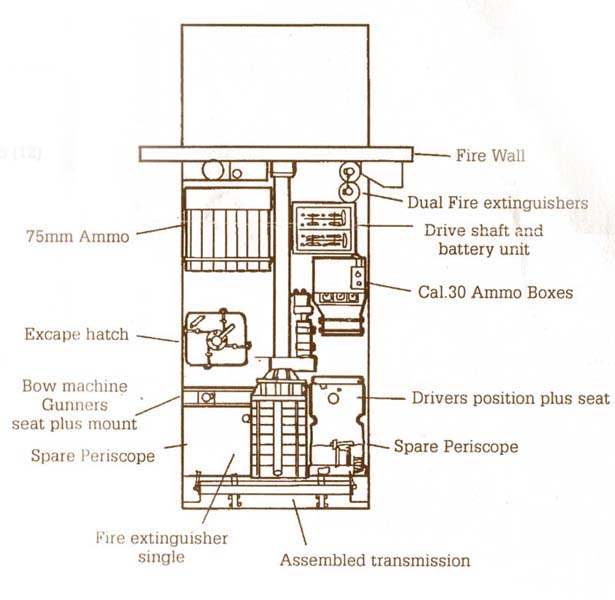 Dans le coin arrière-droit on trouvait une grande armoire pour munitions de 75 mm, alors qu' à gauche, plus en avant, on trouvait une armoire pour munitions de calibre .30. Derrière cette dernière, était installé les batteries. Comme la superstructure occupait toute la largeur du char, les surplombs des chenilles purent être utilisés pour entreposer divers équipements, principalement des armoires à munitions et les panneaux de commandes. A partir de 1944, les M4A3(75) et Shermans(76) furent dotés d' armoiresà munitions de type "humides". Ces armoires avaient des parois creuses remplies d' un mélange anti-feu composé d' eau et d' un produit antigel. Ces armoires devaient pouvoir empêcher les munitions de prendre feu et d' exploser lors d' un coup au but adverse. Cependant cette précaution fut dans beaucoup de cas inutile, vu que les équipages des Shermans, stockaient le plus possible de munitions dans leurs chars, et cela bien sur en dehors des armoires protégées. In the rear-right corner one found a large box for ammunition of 75 mm, whereas on the left, ahead, one found a box for ammunition of .30cal. Behind the latter, was installed the batteries. As the superstructure occupied all the width of the tank, the overhangs of the tracks could be used for stored various equipment, mainly ammunition and the command panels. From 1944, M4A3(75) and Shermans(76) were equipped with ammunition boxes of the "Wet" type. These boxes had hollow walls filled of a fire-resistant mixture composed of water and an antifreeze product. These cupboards were to be able to prevent the ammunition take fire and explode at the time of a blow pierces the shielding. However this precaution was in much case useless, considering that the crews of Shermans, as much as possible stored ammunition in their tanks, of course outside of the protected boxes.