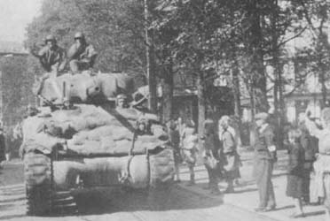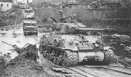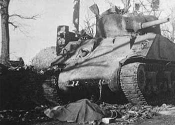 Après le débarquement en Normandie et après être sorti difficilement vainqueur de la bataille de Normandie, les Alliés foncèrent vers l' Allemagne sur les traces d' un armée allemande en déroute. Cependant leur avance fut fortement ralentie aux frontières de l' Allemagne quand les troupes allemandes resserrèrent leur rangs. Durant l' hiver 44-45, ces derniers tentèrent encore un dernier coup de force dans les Ardennes belges (objectif le port d' Anvers pour couper les forces ennemies en deux) avec leur dernières forces. Après l' échec de cette tentative désespérée, les Alliés prirent les villes de l' ouest de l' Allemagne les unes après les autres. A cette époque la Panzertruppe n' était plus que l' ombre de la puissante force que la propagande allemande mit en exergue tout au long du conflit. Les quelques groupes de combats hétéroclites ne purent s' opposer à la marée de chars que les Alliés leur opposèrent. Les Américains ne purent jamais vraiment compter sur un véritable char de combat. Rappelons que le Sherman était avant tout un char d' infanterie. Il tentèrent de rattraper le coup avec le canon de 76 mm mais les modèles de ce type furent toujours minoritaire au sein des forces blindées américaines. Néanmoins en raison de sa simplicité qui facilita la production de masse, le Sherman put être mis au combat en telles quantités que les Allemands ne purent y faire face. Rajoutons l' aviation (la meilleure arme antichar alliée) et la raréfaction de l' opposition blindée adverse (en raison des dégâts portés sur les effectifs et la production). Dans ces conditions la victoire était inévitable. After the landing in Normandy and having left not easily victorious the battle Normandy, the Allies sank towards Germany on the traces of a German army in rout. However their advance was strongly slowed down at the borders of Germany when the German troops tightened their rows. During winter 44-45, the latter still tried a last offensive in the Belgian Ardennes (objective the wearing of Antwerp to divide the enemy forces in two) with their last forces. After the failure of this desperate attempt the Allies took the cities of the west of Germany the ones after the others. At that time Panzertruppe was the phantom of the powerful force than German propaganda put forward throughout conflict. The few groups of heteroclite combat could not be opposed to the tide of tanks which the Allies opposed to them. The Americans could never really count on a genuine battle tank. Let us recall that Sherman was was created like tank of infantry. It tried to compensate for this error with the gun of 76 mm but the models of this type were always minority within the American armoured forces. Nevertheless because of its simplicity which facilitated the mass production, Sherman could be put at the combat in such quantities that the Germans could not face there. Let us add aviation (the best allied anti-tank weapon) and the rarefaction of the ennemy armoured opposition (because of the damage related to strengths and production). Under these conditions the victory was inevitable.