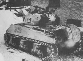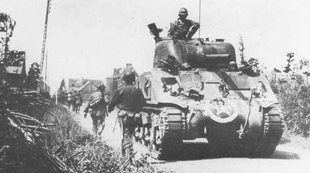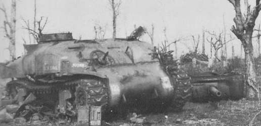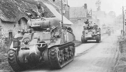Alors que la campagne d' Italie battait encore son plein, les Shermans débarquèrent en masse en Normandie en juin 1944. La majorité était encore des Shermans(75) mais déjà des Shermans(76) furent jetés dans la bataille. Ces derniers étaient équipés du canon de 76 mm jusque là monté exclusivement sur les Tank Destroyers. Ce changement provient d' un autre changement survenu dans la doctrine de guerre américaine. En effet, les théoriciens américains avaient entre-temps convenu que le Sherman qui était au départ un char de support d' infanterie était en raison des réalités du terrain surtout utilisé comme char de combat contre d' autres chars. Dans cette optique le canon de 75 mm aux performances antichar trop limitées étaient devenu insuffisant et il fut décidé de le remplacer par le canon de 76 mm à haute vélocité dont les obus perforants pouvaient percer pratiquement tout les blindages à distance. C' était urgent car le canon de 75 mm était incapable de percer le blindage frontale d' un Panther ou d' un Tiger sans que le Sherman se positionne à moins de 500 m (voir plus proche encore) de sa cible. Cela mettait bien entendu l' équipage en grand danger alors que les canons des Tigers et Panthers pouvaient facilement percer tout blindage allié à des distances beaucoup plus importantes. Il fut en fait calculé, qu' il fallait cinq Shermans pour détruire un seul Tiger, au prix de quatre chars américains ! En fait un Sherman isolé n' avait de chance de détruire un char lourd allemand que par une attaque de flanc ou par derrière, où le blindage était moindre. Le canon américain de 76 mm avec son homologue britannique de 77 mm (17-Pdr) rétabliront l' équilibre au point de vue matériel. Cependant ces modèles ne représentèrent qu' une petite partie des Shermans en opération. En effet les Shermans(76) ne représentèrent que 22% de la production totale de Sherman (en fait il y avait en moyenne 7 Shermans(75) pour 2 Shermans(76). Heureusement que le nombre de chars allemands ne faisaient que diminuer. Il faut en remercier principalement la toute puissante aviation alliée qui en détruisit un nombre incalculable (parfois des colonnes entières). Whereas the campaign of Italy still beat its full, Shermans landed in mass in Normandy in June 1944. The majority was still Shermans(75) but already Shermans(76) were thrown in the battle. The latter were equipped with the gun of 76 mm hitherto assembled exclusively on the Tank Destroyers. This change comes from another change which has occurred in the doctrines of American war. Indeed, the American theorists had agreed meanwhile that Sherman which was at the beginning an infantry support tank was because of the field realities especially used as battle tank counters other battle tanks. Accordingly the gun of 75 mm to the too limited anti-tank performances had become insufficient and it was decided to replace it by the gun of 76 mm to high swiftness whose piercing rounds could practically bore all the shieldings at distance. It was urgent because the gun of 75 mm was unable to bore the frontal shielding of a Panther or Tiger without that the Sherman is at less than 500 m (see nearer still) of its target. That of course put the crew in great danger whereas the guns of Tigers and Panthers could easily bore all Allies shielding at distances much more significant. It was in fact calculated, that five Shermans were needed to destroy only one Tiger, at the price of four American tanks! In fact insulated Sherman was likely to destroy a German heavy tank only by one attack of side or back where the shielding was less. The American gun of 76 mm with its British counterpart of 77 mm (17-Pdr) will restore balance from the material point of view. However these models represented only one small part of Shermans in operation. Indeed Shermans(76) represented only 22% of the total production of Sherman (in fact there were on average 7 Shermans(75) per 2 Shermans(76)). Fortunately the number of German tanks decreased unceasingly. It is necessary to thank for it mainly the very powerful allied aviation which destroyed an incalculable number of it (sometimes whole columns).