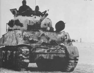 En plus de ses insuffisances opérationnelles (blindage, faible vélocité du canon et équipages novices) les Shermans(75) souffraientt du retard des Américains au niveau de l' emploi de la force blindée. En effet la doctrine américaine du début de la guerre stipulait que les chars de combat devait être utilisés comme chars d' infanterie afin de fournir à cette dernière un appui feu lors de ses assauts contre des positions fortifiées. Les Shermans remplissait le rôle que les canons d' assauts (StuGs et autres Sturmpanzers et Panzers IV initiaux) remplissaient du côté allemand. Ils ne devaient en aucun cas engager les chars adverses, cette fonction étant destinée aux tank destroyers (chasseurs de chars) et leurs canons de 76 mm à haute vélocité. Cette doctrine explique pourquoi les Shermans furent équipés du canon de 75 mm très efficace quant il tirait des obus explosifs contres des positions fortifiées (bunkers, nid de mitrailleuses ou de canons, habitations...) mais beaucoup moins quant il s' agissait de mettre à feu des obus perforants. En effet, le canon était trop court pour fournir la vélocité nécessaire au projectile pour percer des blindages épais. Le canon de 75 mm était d' ailleurs complètement inefficace contre le blindage frontale d' un Tiger ou même d' un Panther. Le canon de 75 mm possédait donc de faibles capacités antichar. En dépit de cette faiblesse, la robustesse de ses composants et sa très grande mobilité, firent du Sherman l' un des meilleurs chars du moment. En effet, le Sherman était un char passe-partout, beaucoup plus fiable et solide mécaniquement que ces opposants de l' Axe. On pouvait en exiger beaucoup et il ne nécessitait que peu de maintenance en raison de la longue durée de vie de ses divers composants. De ce côté, le Sherman avait un net avantage sur ses opposants allemands, trop sophistiqués et trop peu fiables mécaniquement (surtout les chars lourds comme le Panther et le Tiger). Après la campagne d' Afrique du Nord, les Shermans participèrent à la campagne d' Italie où ils supplantèrent définitivement le M3 devenu obsolète. Les terrains au sud de l' Italie n' étant pas trop différent de ceux d' Afrique du Nord (la poussière remplace tout simplement le sable), les modèles qui participèrent au début de cette campagne étaient encore dans leur configuration africaine (filtres à air spéciaux). Cependant en prévision des futures campagnes en Europe du nord (et même au Nord de l' Italie) où les terrains étaient plus humides et mous, des milliers de Shermans retourneront à l' usine au États-Unis ou au Canada et en Angleterre pour être recalibrés pour de tels climats. In addition to its operational insufficiencies (shielding, weak swiftness of the gun and novice crews) Shermans(75) suffered from the delay of the Americans on the level of the use of the armoured force. Indeed the American doctrines of the beginning of the war stipulated that the tanks was to be used as tanks of infantry in order to provide to the latter a fire support during its attacks against fortified positions. Shermans filled the role that the assault guns (StuGs and other Sturmpanzers and initial Panzers IV) filled on the German side. They were not to engage the opposing tanks, this function being intended for the tank destroyers and their guns of 76.2 mm to high swiftness. These doctrines explain why Shermans were equipped with the very effective gun of 75 mm as it fired high-explosive rounds counter fortified positions (bunkers, nest of machine guns or guns, houses...) but much less as it acted to put at fire piercing rounds. Indeed, the gun was too short to provide the swiftness necessary to the projectile to bore thick shieldings. The gun of 75 mm was completely ineffective against the frontal shielding of a Tiger or even of a Panther. The gun of 75 mm thus had low canti-tank apacities. In spite of this weakness, the robustness of its components and its very great mobility, did of Sherman one of the best tanks of the moment. Indeed, Sherman was a pass key tank, much more reliable and solid mechanically that these opponents of the Axis. One could require of it much and it required only little maintenance because of the long lifespan of its different components. This side, Sherman had a clear favours over its German opponents, too sophisticatedand too not very reliable mechanically (especially heavy tanks like the Panther and Tiger). After the campaign of North Africa, Shermans took part in the campaign of Italy where they definitively supplanted M3 become obsolete. The grounds in the south of Italy not being too different from those of North Africa (dust replaces sand quite simply), the models which took part in the beginning of this campaign were still in their African configuration (special air filters). However in forecast of the future campaigns in Northern Europe (and even in the North of Italy) where the grounds were wetter and soft, thousands of Shermans will turn over to the factory to the United States or Canada and to England to be reconverted for such climates there.