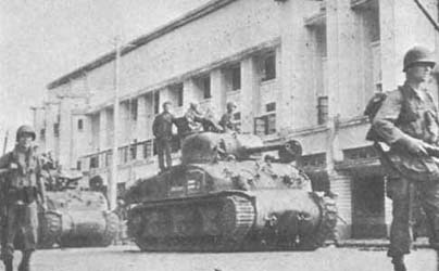Dans le Pacifique la reconquête s' intensifiait, les Américains reprirent les Philippines en 44-45 et s' attaquèrent au Japon. Bien que les Japonais défendirent chèrement leur peau, les Shermans ne rencontrèrent que rarement une opposition de blindés digne de se nom. Le plus gros danger venait des armes antichars japonaises embusquées dans la végétation abondante. On sait que les Américains préfèrent utiliser la bombe atomique plutôt que continuer la guerre conventionnelle aux prix de lourdes pertes. In the Pacific the reconquest intensified, the Americans took again the Philippines into 44-45 and attacked Japan. Although the Japanese defended their skin dearly, Shermans met only seldom an opposition worthy of name of armoured tanks. The largest danger came from the ambushed Japanese anti-tank weapons in the abundant vegetation. It is known that the Americans prefer used the atomic bomb rather than to continue the conventional war at the prices of heavy losses.