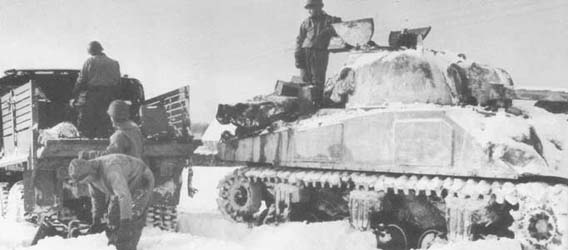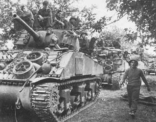 Lorsque les Britanniques débarquèrent en Normandie en 1944, ils comptabilisaient 1900 Shermans sur un total de 2740 chars. En moyenne il y avait 2 Shermans pour 1 char britannique au sein des brigades blindées de la Royal Army. Les forces indiennes et anglaises utilisèrent également le Sherman durant la campagne de Birmanie. Quant à la Russie elle recevra quelques 4000 exemplaires de ce char. En 1944 les Britanniques commencèrent à équiper leurs Shermans de canon de 17-Pdr (77 mm) et baptisèrent ces modèles Firefly (Luciole). Les Shermans Firefly étaient capables de rivaliser avec n' importe quels chars allemands mais seulement 600 chars furent convertis de la sorte. Les Américains connurent le baptême du feu avec leurs Shermans face aux Panzers de Rommel en Afrique du Nord, fin 1942. Leur inexpérience et les défauts originaux des premiers Shermans ne leur facilita pas la tâche. Mais au fil de la production et des combats, les modèles et les équipages s' améliorèrent. When the British landed in Normandy in 1944, they had 1900 Shermans on a total of 2740 tanks. On average there were 2 Shermans for 1 British tank within the armoured brigades of Royal Army. The Indian and English forces also used Sherman during the campaign of Burma. As for Russia it will receive some 4000 specimens of this tank. In 1944 the British started to equip their Shermans with gun of 17-Pdr (77 mm) and baptized these models Firefly. Shermans Firefly were able to destroy any German tanks but only 600 tanks were converted. The Americans knew the baptism of fire with their Shermans vis-a-vis Rommel's Panzers in North Africa, at the end of 1942. Their inexperience and the original defects of first Shermans did not facilitate the tasks to them. But with the wire of the production and the combat, the models and the crews improved.