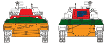 La partie arrière était composée de deux plaques. La plaque supérieure appartenant à la superstructure avait une forme de trapèze et était dotée en son centre d' une trappe rectangulaire boulonnée; la plaque supérieure faisait toute la largeur du char et était également munie de deux phares arrière. En dessous se trouvait la large plaque arrière du bas de caisse. Cette plaque était dotée en son centre d' une large trappe rectangulaire boulonnée. Les trappes boulonnées servaient en toute logique à l' entretien du moteur. La plaque arrière inférieure disposait également de deux boucles de remorquage et d' un crochet de remorquage montés sur une traverse parcourant toute la largeur de celle-ci. The rear part was made up of two plates. The upper plate belonging to the superstructure had the shape of trapezoid and was equipped in its center with a bolted rectangular trap door; the upper plate made all the width of the tank and was also provided with two headlights back. Below was the broad back plate of the lower hull. This plate was equipped in its center with a broad bolted rectangular trap door. The bolted trap doors were useful in all logic for the maintenance of the engine. The lower rear plate also had two loops of towing and a hook of towing assembled on a cross-piece traversing all the width of this one.
