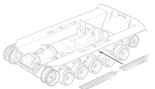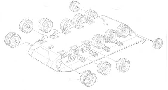 La suspension était complétée par deux barbotins avant, deux poulies de tension de chenille arrière et 8 double-rouleaux porteurs. La suspension à barres de torsion était supérieur à la suspension verticale classique car elle offrait une meilleure répartition du poids et une meilleure assise. De plus les amortisseurs procuraient un meilleure confort de marche à l' équipage. La suspension à barres de torsion de type américaine était moins sujette aux blocages par la neige gelée ou la boue que celle de type allemande avec ses galets imbriqués ou entrelacés (à double ou à triple recouvrement). Elle était de plus beaucoup plus facile à entretenir. The suspension was supplemented by two front sprocket-wheels, two back idlers and 8 double-return rollers. The suspension with torsion bars was higher than the traditional vertical suspension because it offered a better distribution of the weight and a better base. Moreover shock absorbers got a better comfort of drive to the crew. The suspension with torsion bars of the American type was less often victim of blockings by cold snow or mud that that the German type with its overlapped or interlaced road wheels (with double or triple covering). It was moreover much easier to maintain.