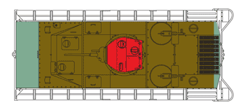 Le compartiment moteur accueillait accueillait le même moteur hérité du M3A1 Light Tank, le Continental W-670-9A (essence) de 7 cylindres développant 250 à 262 CV. Ce moteur permettait au Amtank d' atteindre les 40 km/h sur terre et les 11 km/h dans l' eau. Le LVT(A)-2 avait une autonomie de 201 km sur terre et de 120 km dans l' eau. L' arbre de transmission parcourait tout le compartiment de combat en longueur pour rejoindre la transmission de type Synchromesh (synchronisée) comportant 6 rapports (5/1). La puissance était transmise aux barbotins avant. Les réservoirs de carburant étaient à obturation automatique, pour empêcher tout risque de feu et d' explosion. The engine compartment accomodated the same engine inherited of the M3A1 Light Tank, the Continental W-670-9A (gasoline) of 7 cylinders developing 250 to 262 hp. This engine made it possibleto Amtank to reach the 40 km/h on ground and the 11 km/h in water. The LVT(A)-1 had an autonomy of 201 km on ground and 120 km in water. The driveshaft traversed all compartment of combat in length to join the transmission of the Synchromesh type (synchronized) comprising 6 speeds (5/1). The power was transmitted to the front sprocket-wheels. The fuel tanks were with automatic obturation, to prevent any risk of fire and explosion.