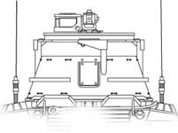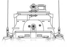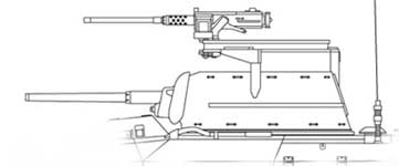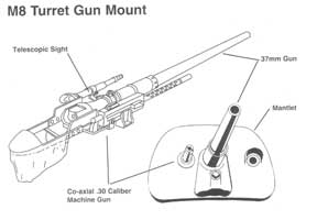 Le compartiment de combat était surmonté d' une petite tourelle en forme de bassine renversée, ouverte au dessus. Elle accueillait un canon de 37 mm M6 monté sur un affût M6 avec une mitrailleuse .30cal (7.62 mm) coaxiale (à droite) et d' une lunette télescopique (à gauche). Le stock de munitions comprenait 80 projectiles de 37 mm et 1500 balles de 7.62 mm pour la mitrailleuse coaxiale. L' armement antiaérien d' origine était soit constituée d' une mitrailleuse .30cal montée à l' arrière de la tourelle, soit d' une mitrailleuse .50cal montée sur piédestal à l' avant de la tourelle ou encore des deux. Plus tard une mitrailleuse .50cal (12.7 mm) antiaérienne fut montée sur un affût circulaire M49 sur le toit de la tourelle. Le stock de munitions pour cette arme comprenait 400 ballesl. Les obus de 37 mm étaient rangés des des râteliers sur le pourtour de la tourelle et dans des casiers dans le compartiment de combat. La tourelle accueillait les deux derniers hommes d' équipage: le commandant-chargeur assis à droite, et le tireur assis à gauche. The compartment of combat was surmounted by a small turret in the shape of reversed basin, opened to the top. It accomodated a gun of 37 mm M6 assembled on a M6 mounting with a machine-gun .30cal (7.62 mm) coaxial (on the right) and of telescopic glasses (on the left). The stock of ammunition included 80 projectiles of 37 mm and 1500 rounds of 7.62 mm for the coaxial machine-gun. The original anti-aircraft armament was a .30cal machine-gun mounted to the back of the turret, or a .50cal machine-gun mounted on pedestal in front of the turret or both. Later an anti-aircraft .50cal machine-gun (12.7 mm) was assembled on a circular mounting M49 on the roof of the turret. The stock of ammunition for this weapon included 400 rounds. The shells of 37 mm were arranged in racks on the circumference of the turret and in racks in the compartment of combat. The turret accomodated the last two men of crew: the commander-loader sitting on the right, and the gunner sitting on the left.