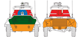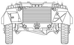La plaque arrière de la caisse en forme de trapèze renversé était dotée d' une vaste grille d' aération à lames, de deux boucles de remorquage, d' une attache de remorque et de deux phares arrière. Le plateau arrière possédait deux vastes trappes d' accès montées sur charnières, s' ouvrant vers l' intérieur. Chaque trappe possédait une entrée d' air surmontée d' un couvercle blindé. Devant ces trappes se trouvait l' orifice du réservoir d' essence (capacité de 212 l) qui était protégé par un couvercle blindé. Le carburant embarquait procurait au M8 une autonomie d' environ 560 km. The back plate of the hull in the shape of reversed trapezoid was equipped with a vast grid of ventilation with blades, two loops of towing, a back fastener of trailer and two headlights. The rear deck had two vast trap doors of access mounted on hinges, opening towards the interior. Each trap door had an air intake surmounted by an armoured lid. In front of these trap doors the opening of the gasoline fuel tank was (capacity of 212 L) which was protected by an armoured lid. The fuel load got for M8 an approximately autonomy of 560 km.