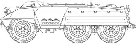 M8 Greyhound Armored Car Design A l' extérieur, le M8 était doté sur les côtés de coffres de rangement (le long du compartiment moteur) et de jupes blindées amovibles protégeant le train avant et le train arrière. Entre les jupes blindées, un râtelier (présent des deux côtés) pouvait accueillir 3 mines antichar. Ce râtelier était parfois remplacé par un porte-jerrycan. Derrière la tourelle de chaque côté se trouvaient deux antennes radio. At outside, M8 was equipped on the sides with trunks of arrangement (along the engine compartment) and with removable armoured skirts protecting the nose gear and the rear wheel-axle unit. Between the armoured skirts, a rack (present on the two sides) could accomodate 3 anti-tank mines. This rack was sometimes replaced by a carry-jerrycan. Behind the turret on each side were two radio antennas.