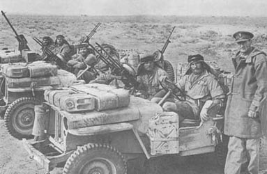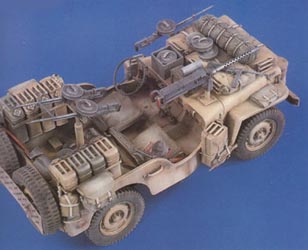 Ces exemplaires étaient peints en jaune sable. Pour réduire rapidement l' opposition ennemie, les Jeeps SAS étaient dotées de cinq mitrailleuses: un couple sur affût pivotant à l' arrière, un autre couple fixe à l' avant à droite et une dernière toujours à l' avant mais à gauche (cet disposition pouvait changer selon les équipages). A causes des mitrailleuses avant, ces Jeeps n' avaient pas de pare-brise. Pour de longs trajets dans le désert, deux réservoirs supplémentaires (d' une capacité totale de 135 l) étaient installés à l' arrière et un nouveau système de refroidissement amélioré fut installé. These specimens were painted in sands yellow. To reduce the enemy opposition quickly, Jeeps SAS were equipped with five machine-guns: a couple on swivelling mounting to the back, another fixed couple in the front-right and a last always in front but on the left (this provision could change according to crews). Because of the front machine-guns, these Jeeps did not have a windshield. For long ways in the desert, two additional tanks (of a total capacity of 135 L) were installed to the back and a new improved system of cooling was installed.