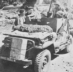 Durant la formation de la Tank Destroyer Force, la Jeep servit d' affût mobile pour le canon antichar de 37 mm. Ce modèle intérimaire, n' était guère réussi: le canon était monté à l' arrière du véhicule et il n' y avait guère de place pour les munitions (il y a la solution d' utiliser une remorque). Le châssis était rudoyé par l' utilisation du canon. Le canon de 37 mm fut finalement vite considéré comme obsolète. Notons encore que certaines Jeeps furent dotées à l' avant d' une barre de fer. Cette barre servait à couper les fils (barbelés ou autre) tendus en travers des routes par les Allemands qui décapitèrent un certain nombre de passagers. During the formation of the Tank Destroyer Forces, the Jeep was used as mobile mounting for the anti-tank gun of 37 mm. This temporary model, wasn't a success design: the gun was assembled to the back of the vehicle and there was hardly place for the ammunition (there is the solution to use a trailer). The chassis was knocked about the use of the gun. The gun of 37 mm was finally quickly regarded as obsolete. Still let us note that certain Jeeps were equipped in front with a vertical iron bar. This bar was used to cut wire (barbed or different) tended across the roads by the Germans who decapitated a certain number of passengers.
