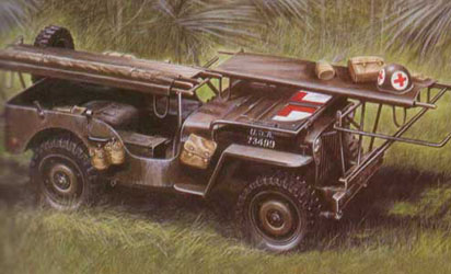 La Jeep fut également transformée en véhicule sanitaire tout terrain de première ligne. Les modifications apportées permettaient de transporter 3 brancards dans des conditions à vrai dire peu confortables. The Jeep was also transformed into cross-country medical vehicle of first line. The modifications made possible to transport 3 stretchers under conditions to tell the truth not very comfortable.
