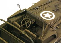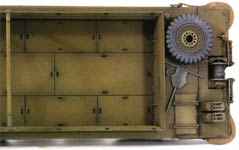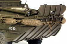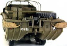 2 1/2 Ton, 6x6, Amphibian Truck, GMC DUKW-353 Lors d'un débarquement, un des gros problèmes rencontré, concernait le ravitaillement lourd. En effet il fallait disposer de véhicules amphibies capables d'effectuer le transbordement entre les cargos mouillés au large et les plages de débarquement. Les Américains créèrent dans un premier temps la famille des LVT (Landing Vehicle Tracked) regroupant toute une série de véhicules amphibies entièrement chenillés capables de franchir les récifs et de se mouvoir sur des terrains hostiles. Cependant ces véhicules étaient surtout utiles dans le Pacifique où ce genre d'obstacles étaient fréquents. Pour l'Europe il en était autrement, en effet les récifs étaient très rares, le réseau routier était conséquent (inexistant sur la plupart des îles et îlots du Pacifique) et les distances à parcourir après débarquement sans commune mesure (toute la différence entre des îles moyennes voire minuscules et un continent). Il fallait donc un véhicule amphibie capable de se comporter sur terre comme n'importe quel camion cargo. Le cahier des charges fut mis au point par le OSRD (Office of Scientific Research and Development) et pouvait se résumer en trois points: le véhicule devaient avoir les performances terrestres d'un véhicule conventionnel et ses dimensions, et les parties mécaniques devaient être communes à celles des autres véhicules terrestres. At the time of a landing, one of the big problems met, concerned the heavy re-provisioning. In fact it was necessary to have access to amphibious vehicles able to carry out the unloading between the freighters to the the disembarkation beaches. The American created previously the family of the LVT (Landing Vehicle Tracked) grouping a series of amphibious full tracked vehicles able to cross the reefs and to move on hard grounds. Nevertheless these vehicles were especially useful in the Pacific where this kind of obstacles were frequent. For europe it some was otherwise, in fact the reefs were very rare, the road network was consequent (nonexistent on most of the islands of the Pacific) and the distances to traverse after landing without commune measures (the whole difference enters medium indeed tiny islands and a continent). It was necessary therefore an amphibious vehicle able to move on ground as any cargo truck. The specifications was perfected by the OSRD (Office of Scientific Research and Development) and could summarize itself in three points: the vehicle had to have ground performances of a conventional vehicle and its dimensions, and the mechanical parties had to be common to the one of the other ground vehicles.