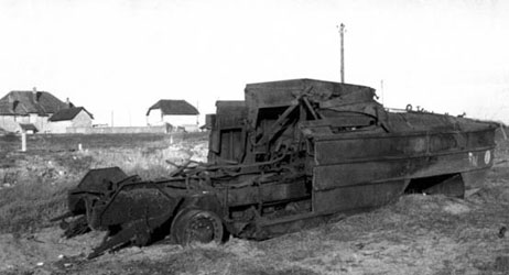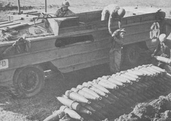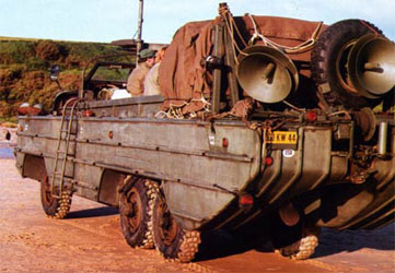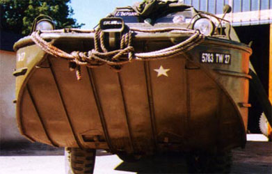 Entre 1942 et la fin de la guerre, 21000 DUCKs furent fabriqués. Cet engin était facile à produire et à entretenir car il utilisait au maximum des éléments du camion CCKW-353. Ce véhicule qui n'était pas tout terrain, se comportait cependant assez bien sur les plages mais rencontrait de grandes difficultés sur la boue molle. Les Ducks furent utilisés sur tous les théâtres d'opération par les Alliés. Pour se déplacer dans l'eau, le Duck était équipé d'une hélice entraînée par le moteur principal et il se dirigeait grâce à un gouvernail. Le pilote et son assistant était assis devant le compartiment-cargo capable de transporter autant des caisses que des armes d'artillerie légère. Il arrivait parfois que de pièces d'artillerie fassent feu à bord du Duck et celui-ci était utilisé comme affût mobile. Between 1942 and the end of the war, 21000 DUCKs were made. This vehicle was easy to produce and to maintain because it used a maximum of elements of the truck CCKW-353. This vehicle that didn't be a cross-country vehicle, behaved nevertheless enough well on the beaches but met big difficulties on soft mud. The Ducks were used on all operation theaters by the Allies. To move in water, the Duck was equipped of a propellor induced by the main engine and it was directed thanks to a rudder. The pilot and his assistant was sat in front of the cargo area able to transport as much boxes that light artillary weapons. It arrived sometimes that guns fired on board of the Duck and this one was used as mobile mounting.