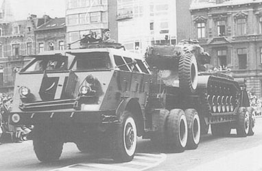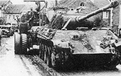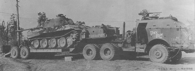 Pendant le transport de chars à canons longs, la tourelle était orientée vers l'arrière, pour ne pas être susceptible d'endommager accidentellement l'échappement ou le bras du levage du tracteur. During the transport of long gun tanks, the turret was directed towards the back of the tank, not to be likely accidentally to damage the exhaust or the arm of lifting of the tractor. Le Fragon wagon fit son apparition en Italie en septembre 1943 où il fut particulièrement employé pour la récupération et la réparation des chars Sherman. Il fut également employé pour le transport des bateaux et de tout autre équipement à durant la traversée du Rhin. Notons comme vous pouvez le voir sur plusieurs photographies, des Dragons Wagon furent utilisés pour récupérer les chars allemands (Panthers en particulier). The Dragon Wagon made its appearance in Italy in September 1943 when it was especially used for the recovery and the repair of the Sherman tanks. It was also used for the transport of boats and other equipment at the time of the crossing of the Rhine. Let us note as you can see it on several photographs, that Dragons Wagon were used to recover German tanks (Panther in particular).