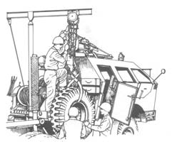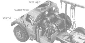 Le chargement et le déchargement des chars sur la semi-remorque M15, se faisaient grâce aux deux treuils jumelés situés derirère la cabine du tracteur M25. Ces treuils étaient mus par un moteur installé devant, dans la cabine dont la puissance était transmise aux treuils par une transmission à cadran et à chaîne. Le treuil avait une puissance de 17.5 tonnes et le treuil arrière, une puissance de 30 tonnes. L'opérateur des treuils se tenait sur une plateforme à proximité. Il vérifiait le chargement tout en enclenchant si besoin en est, les leviers et les pédales commandant des gaz, les embrayages et les freins. Les treuils pouvaeint être utilisés conjointement où séparément. La semi-remorque M15 avait été conçue pour transporter un char de 36,28 tonnes, c.-à-d. principalement pour lechar moyen standard de l'armée américaine, M4 Sherman. La partie centrale comportait deux glissières (une face en bois, l'autre en acier). Elles étaient utilisées pour guider le char durant le chargement et empêchaient tout déplacement latéral durant le transport. Le positionnement des glissières pouvait être modifié pour s'adapter à la largeur des différents types de chars. Quand la remorque était vide, ces glissières étaient rabattues. Toujours selon le type de chars(et du poids) ou du terrain, l'espacement des huit roues arrière pouvait être modifié. Durant le chargement, les quatre roues internes étaient protégées contre les chenilles du char par les protections démontables habituellement stockées devant la plateforme. Des glissières démontables pouvaient également être installées sur les faces internes des rampes de chargement. Durant le transport, ces glissières étaient rangées avec les cales, les planches etc..... dans les caissons à outillage ou sous la plateforme. The loading and the unloading of tanks on the M15 semitrailer, were possible thanks to the two twinned winches located at the back of the M25 tractor. These winches were driven by an engine installed in front of the cabin whose power was transmitted to the winches by a transmission with dial and chain. The front winch had a power of 17.5 tons, and the rear winch, a power of 30 tons. The operator of the winches was held on a platform in the vicinity. He checked the loading while actuating if need be, the levers and the pedals controlling gases, the clutches and the brakes. The winches could be used jointly where separately. The M15 semitrailer had been designed to support a tank of 36.28 tons, i.e. mainly for the standard medium tank of the American army, M4 Sherman. The central part comprised two slides (a face out of wooden, a steel face). These last were used to guide the tank at the time of the loading and prevented any side displacement at the time of transport. The positioning of the slides could be modified to adapt to the width of different type of tanks. When the trailer was empty, these slides were folded back. Always according to the type of tanks (and of the weight) or of the ground, the spacing of the eight rear wheels could be modified. At the time of the loading, the four wheels intern were protected from the tracks of the tank by the removable protections usually stored in front of the platform. Removable slides could also be installed on the internal face of the loading ramps. At the time of transport, these slides were arranged with the holds, boards etc... in trunks with tools or under the platform.
