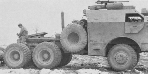 Le M26 Dragon Wagon était en fait l'association du tracteur M25 et de la semi-remorque M15. Le M25 était équipé d'un treuil de 15,9 tonnes à l'avant et de deux treuils de 27 tonnes et divers machines-outils à l' arrière pour pouvoir être en mesure de tracter (seul, sans remorquee) un véhicule blindé, ou pour effectuer des réparations sur place. M26 Dragon Wagon was in fact the association of the M25 tractor and the M15 semitrailer. M25 was equipped with a winch of 15.9 tons in front and of two winches of 27 tons to the back and various machine tools to be able to tractor draw (only, without trailer) an armoured vehicle, or to carry out repairs on the ground.