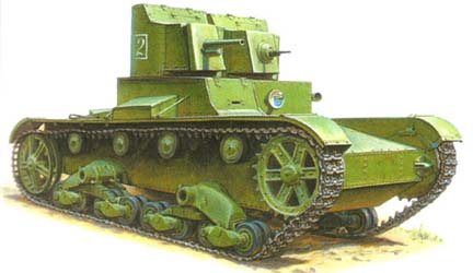 T-26 Light Tank Durant les deux premières années de production (1931-1932), seule la version à deux tourelles fut produite aussi appelée à l' étranger T-26A (appellation non utilisée par les Russes). Chaque tourelle était armée avec une mitrailleuse. Cependant des versions de commandement furent équipés d' un canon de 37 mm sur la tourelle de droite. During the first two years of production (1931-1932), only the version with two turrets was produced also called with foreigner T-26A (name not used by the Russians). Each turret was armed with a machine-gun. However versions of command were equipped with a gun of 37 mm on the turret of right.