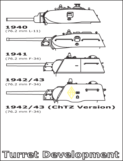 Le 26 septembre 1940, le responsable du projet T-34, M.I. Koshkin décède. Il fut remplacé par A.A. Morozov qui verra la naissance de deux nouvelles variantes du T-34. La première variante fut l'A-41, fut une tentative de résoudre les défauts d' origine sans modifier la caisse et le train de roulement du T-34. Il devait cependant être doté d' une nouvelle tourelle pouvant accueillir trois hommes et dotée d' une circulaire d' un diamètre de 1.70 m alors que le diamètre standard était de 1.42 m. Cette tourelle devait être dotée du nouveau canon de 76.2 mm F-34. Ce modèle prometteur ne fut cependant jamais finalisé et resta sur les planches à dessins des ingénieurs russes. La seconde version A-43, connue en tant que T-34M, était plus étroite, haute et longue que le modèle de production. Il n' y a pas de classification très précise concernant les différents modèles de T-34/76. Les améliorations successives apportées durant la production et les différents changements apportés par les différents producteurs ne facilitent pas la tâche. On peut cependant établir quatre modèles différents. Les critères utilisés sont en gros la période de production et la tourelle montée sur le T-34. September 26, 1940, the person in charge for the T-34 project, M.I. Koshkin dies. It was replaced by A.A. Morozov which will see the birth of two new alternatives of T-34. The first alternative was A-41, was an attempt to solve the defects of origin without modifying the hull and the train of bearing of T-34. It was however to be equipped with a new turret being able to accomodate three men and equipped with a turret ring of a diameter of 1.70 m whereas the standard diameter was of 1.42 m. This turret was to be equipped with the new gun of 76.2 mm F-34. This promising model was not however never finalized and remained on the drawing boards of the Russian engineers. The second A-43 version, known as T-34M, was narrower, high and long that the model of production. There is no very precise classification concerning the various models of T-34/76. The successive improvements made during the production and the various changes brought by the various producers do not facilitate the task. One can however establish four different models. The criteria used are the period of manufacture and the turret assembled on T-34.