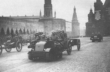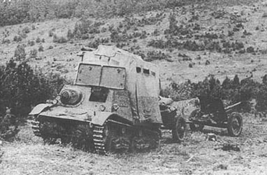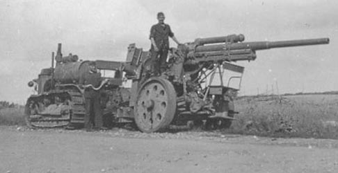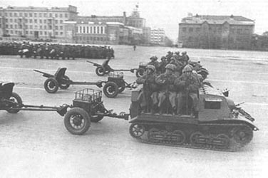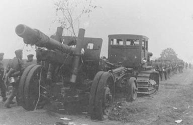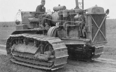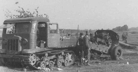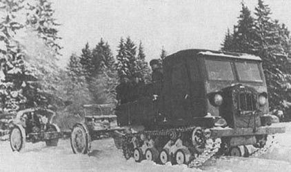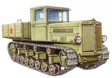 Artillery Prime Movers Depuis ses origines, l'artillerie avait toujours été tracté par des chevaux. Les trains de chevaux variaient bien entendu selon le poids du canon. Ce mode de locomotion ne pouvait dans le meilleur des cas, procurer qu'une vitesse maximum de 10-12 km/h. Les chevaux furent encore largement utilisés durant la 1re guerre mondiale et même au début de la seconde guerre mondiale (l'obusier de campagne de 105 mm de la Wehrmacht était tracté par des chevaux). Cependant l'époque était à la mécanisation et à la motorisation de tous les composants des différentes armées, dont l'artillerie. En Russie, après 1917, quelques douzaines d'usines de voitures et de tracteurs furent créées à cet effet mais seule l'artillerie lourde put réaliser sa totale conversion en artillerie mécanisée. Après la guerre civile, les Russes se débarrassèrent de la plupart des pièces lourdes et conservèrent en priorité les canons de campagne de 76 mm facilement tractable par chevaux. A partir du début des années 20, la toute récente Armée rouge commença à être doter au compte goûte de tracteurs chenillés Bolshevik et Kommunar. Le Bolshevik était destiné à la locomotion de canons de plus de 6 tonnes et le Kommunar destiné à celle de l'obusier B-4 de 230 mm (plus puissant canon soviétique de l'époque). Les canons légers étaient tractés par des voitures. Since its origins, the artillary always had been towed by horses. The trains of horses varied of course according to the weight of the gun. This method of locomotion could not in the better one cases, obtain than a speed maximum of 10-12 km/h. The horses again widely were used during the 1st World War and even at first second World War (the field howitzer of 105 mm of the Wehrmacht was towed by horses). Nevertheless the era was at the mechanisation and to the motorization of all the components of the different armies, of which the artillary. In Russia, after 1917, some dozens of factories of cars and of tractors were created to this effect but single the heavy artillary put to realize its total conversion in mechanized artillary. After the civil war, the Russians themselves separated of most of the heavy pieces and kept in priority the 76 mm field guns easily tractable by horses. From the beginning of the years 20, the all recent red Army started to be to endow in small quantities with tractors Bolshevik and Kommunar. The Bolshevik was intended for the locomotion of guns heavier than 6 tons and the Kommunar destined to the one of the B-4 howitzer of 230 mm (more powerful Soviet gun of the era). The light guns were towed by cars.