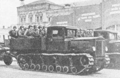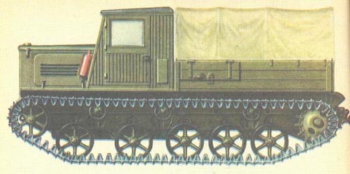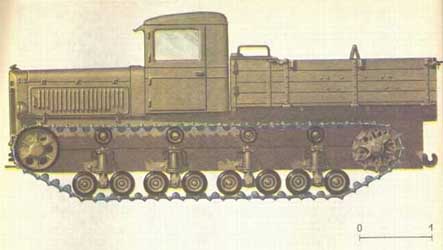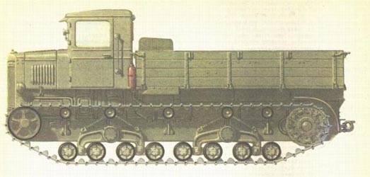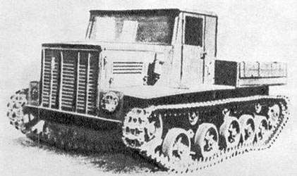 En 1930, le bureau technique général du GVUP VSHKh et le bureau d'étude du OTA travaillèrent sur plusieurs projets de tracteurs (petits/moyens/lourds). Ces véhicules devaient être basés sur des chars en production et en service dans l'Armée rouge. Le développement de tracteurs lourds devait résoudre les problèmes de transport de pièces d'artillerie lourde, d'équipage et de munitions. En 1934, un tracteur de ce type passa tous les tests avec succès et fut accepté pour le service sous le nom de Komintern (Communisme international). Ce tracteur lourd était basé sur le char moyen T-24. Il était propulsé par un moteur de 131 cv de 4 cylindres. Il pouvait atteindre les 30 km/h et grâce à ses 550 l de carburant parcourir 220 km. L'équipage était composé de deux homme. Le Komitern mesurait 5.765 m de long, 2.3 m de large et 2.538 m de haut et pesait 10.5 tonnes. Il avait une garde au sol de 40 cm et une pression au sol de 0.495 kg/cm2 In 1930, the general technical office of the GVUP VSHKh and the design office of the OTA worked on several projects of tractors (small/medium/heavy). These vehicles had to be based on tanks in production and in service in the Red army. The development of heavy tractors had to resolve the transportation problems of heavy guns, crew and ammo. In 1934, a tractor of this type passed all the tests with successes and was accepted for the service under the name of Komintern (international Communistic). This heavy tractor was based on the medium tank T-24. It was propelled by a 4-cylindres engine of 131 hp. It could attain the 30 km/h and thanks to its 550L of fuel to traverse 220 km. The crew was composed from two men. The Komitern measured 5.765 m in long, 2.3 m in wide and 2.538 min height and weighed 10.5 tons. It had a ground clearance of 40 cm and a ground pressure of 0.495 kg/cm2