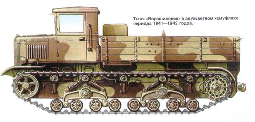 Ce tracteur lourd fabriqué à partir de 1940 et successeur du Komintern pour la locomotion des pièces d'artillerie lourdes. Le Voroshilovets pesait 15.5 tonnes et pouvait transporter 3 tonnes de matériel et tracter en remorque jusqu'à 18 tonnes. Il mesurait 6.22 m de long, 2.35 m de large et 2.74 m de haut. Son équipage était de 3 hommes mais il pouvait transporter 16 passagers à l'arrière sur des banquettes. Il était propulsé par un moteur de 350 cv et pouvait atteindre sur route 36 km/h et parcourir 270 km sur son propre carburant. This heavy tractor made from 1940 and successor of the Komintern for the locomotion of the heavy artillery pieces. The Voroshilovets weighed 15.5 tons and could transport 3 tons of equipment and tow until 18 tons. It measured 6.22 m in length, 2.35 m oin width and 2.74 m in heigh. Its crew was of 3 men but it could transport 16 passengers to the back on feast. It was propelled by a 350 hp engine and could attain on road 36 km/h and traverse 270 km on its own fuel.