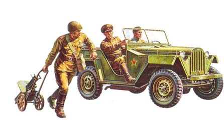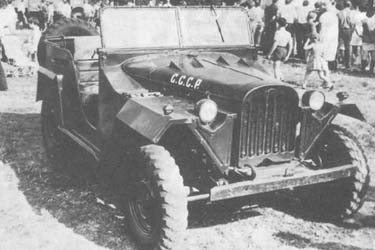 Jusque dans les années trente, l'industrie automobile n'était guère développée en Russie, et ce pays dépendait fortement des importations de Grande-Bretagne, des États-Unis , d'Allemagne, d'Italie ... En 1931-1932, avec l'aide des Américains, les soviétiques installèrent à Gorki une vaste usine automobile, la GAZ (Gorkovski Avtomobilny Zavod). Cette usine commença donc à produire des camions GAZ-A et GAZ-AA (calqués sur les Ford-A et Ford-AA américains) et aussi des voitures de commandement GAZ-M1 avec l'appui technique de Ford. Le premier modèle de 4x4 produit par GAZ fut le GAZ-61 qui inspira fortement le GAZ-64 (fortement inspirés par la Bantam américaine). Even in the thirties, the industry automobile hardly was not developed in Russia, and this country strongly depended on importations from Great Britain, United States, Germany, Italy... In 1931-1932, with the assistance of the Americans, the Soviet installed to Gorki a vast automobile factory, the GAZ (Gorkovski Avtomobilny Zavod). This factory started therefore to produce trucks GAZ-A and GAZ-AA (copied on the American Ford-A and Ford-AA) and also commander cars GAZ-M1 with the technical support of Ford. The first model of 4x4 produced by GAZ was the GAS-61 that inspired strongly the GAZ-64 (strongly inspired by the American Bantam).