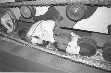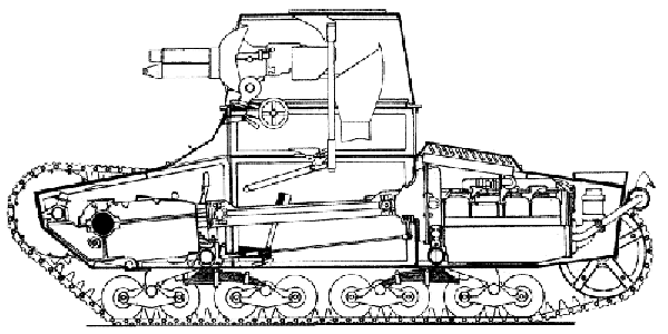 Le moteur était un Armstrong-Siddeley Puma (essence) de 4 cylindres (en ligne), à refroidissement par eau, développant 87-92 ch. Il était couplé à une boîte de vitesse 4 rapports vers l'avant et une marche arrière. La suspension était composée de chaque côté d'un barbotin avant, de deux bogies Vickers à ressorts à lames canteliver dotés chacun de 4 double-galets (acier avec caoutchouc), une poulie de tension arrière et 4 rouleaux porteurs. Chaque unité de suspension pivotait sur son propre axe. Les chenilles de 230 mm étaient composées chacune de 102-103 patins et étaient en contact avec le sol sur 2.70 m. The engine was an Armstrong-siddeley Puma (gasoline) of 4 cylinders (on line), with water cooling, developing 87-92 hp. It was coupled with a gearbox with 4 speeds forwards and a reverse speed. The suspension was made up on each side of a front sprocket-wheel, two Vickers bogies with leaf springs canteliver equipped each one with 4 double road-wheels (steel with rubber), a back idler and 4 return rollers. Each unit of suspension swivelled on its own axis. The tracks of 230 mm were made up each one of 102-103 links and were in contact with the ground on 2.70 m.