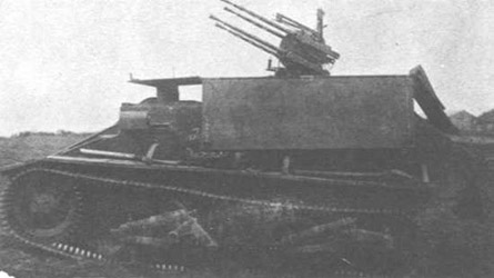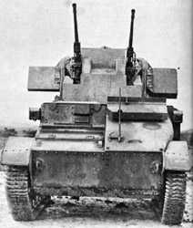 Light Tanks Mark I-VI Conversions Quand les chars légers Vickers furent remplacés sur les champs de bataille en 1941 par les chars américains M3 Stuart, les Britanniques décidèrent de convertir les caisses disponibles en chars anti-aériens. L'équipage fut réduits à deux hommes et l'armement porté à 4 mitrailleuses de 7.92 mm ou deux de 15 mm. Ces conversions assez artisanales ne furent guère des réussite car le pointage ne se faisait pas grâce à un servo-mécanisme et les armes avaient une portée assez faible. Certains en Égypte furent reconvertis en chars observatoires d'artillerie. When the light tanks Vickers were replaced on the battle fields in 1941 by the American tanks M3 Stuart, the British decided to convert the hulls available into anti-aircraft tanks. The crew was reduced at two men and the armament carried to 4 machine-guns of 7.92 mm or two of 15 mm. These conversions rather artisanal was hardly success because the pointing was not done thanks to a servomechanism and the weapons had a rather weak range. Some in Egypt were reconverted in observatories of artillery tanks.