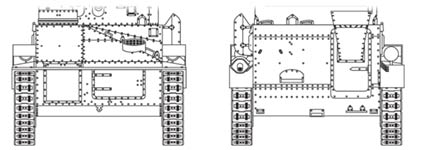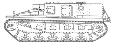 Vickers Medium Tanks Mk.I/II & III Design Mark I/II Le Mark II (mais aussi le Mark I) avait l'aspect d'un caisson rectangulaire aux parois verticales sur les côtés et l'arrière. Seule la partie avant comportait des plaques inclinées. Dans le poste de conduite, au centre, on pouvait trouver la boîte de vitesses (4-4), les commandes, la pédale d'embrayage, le frein, l'accélérateur, les leviers de changement de vitesse et des freins (devant le pilote) et les palonniers (de part et d'autre du pilote). Le moteur contrairement à la plupart des chars conventionnels ne se trouvait pas à l'arrière, mais à l'avant à gauche du poste de conduite. Il s'agissait d'un moteur V8 Armstrong-Siddeley développant 90 cv. Le moteur était difficile d'accès, mais permettait au char d'assez bonnes performances à basse vitesse. Il était doté d'un système facilitant le démarrage. La transmission située derrière le moteur transmettait la puissance de celui-ci aux barbotins arrières. Le tourelleau du pilote se soulevait au lieu de s'ouvrir sur les côtés. Sur le Mark II, le poste de pilotage était monté plus haut que sur le Mark I. Mark II (but also Mark I) had the aspect of a rectangular box with vertical walls on the sides and the back. Only the front part comprised tilted plates. In the driver's cab, in the center, one could find the gear box (4-4), the commands, the pedal clutch, the brake, the accelerator, the levers brake and gear shift (in front of the driver) and the swing bars (on both sides of the driver). The engine contrary to the majority of conventional tanks was not at the back, but in front on the left of the driver's cab. It acted of an engine V8 Armstrong-siddeley developing 90 hp. The engine was difficult access, but allowed the tank rather good performances at low speed. It was equipped with a system facilitating the starting. The transmission located behind the engine transmitted the power of this one to the back sprocket-wheels. The small turret of the drive was raised instead to open on the sides. On Mark II, the cockpit was assembled higher than on Mark I.