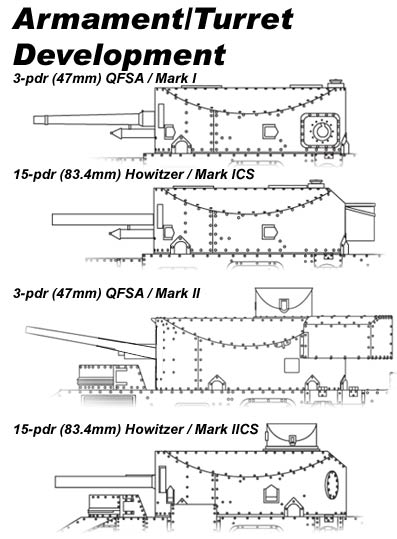 Le blindage était composés de tôles boulonnées d'une épaisseur de 8-12 mm maximum (au lieu de 6.5 mm pour le Mark I), ce qui n'offrait à l'équipage une protection relative que contre les armes de petit calibre. L'armement consistait en un canon à tir rapide QFSA de 3-pdr (47 mm), 4 mitrailleuses Hotchkiss (deux de remplacement ou de réserve) et 2 mitrailleuses Vickers en casemate (une de chaque côté). Un support pour le tir anti-aérien était également présent sur la tourelle. A partir de 1926, les mitrailleuses Hotchkiss furent supprimées et certains modèles n'avait comme armement secondaire qu'une seule Vickers montée coaxiallement avec le canon sur une nouvelle tourelle avec tourelleau pour le commandant (Mark II Star). Fait amusant, le Mark II pouvait embarquer une petite cuisinière sans fil et des rations de 3 jours. The shielding was composed of bolted sheets of 8-12 mm maximum thickness (instead of 6.5 mm for Mark I), which offered to the crew a relative protection only against the weapons of small caliber. The armament consisted of a gun with fast shooting QFSA of 3-pdr (47 mm), 4 Hotchkiss machine-guns (two of replacement or reserve) and 2 Vickers machine-guns in casemate (one on each side). A support for the anti-aircraft shooting was also present on the turret. From 1926, the Hotchkiss machine-guns were removed and certain models like secondary armament had only one Vickers mounted coaxially with the gun on a new turret with cupola for the commander (Mark II Star). Amusing fact, Mark II could embark a small cooker without wire and 3 days of rations.
