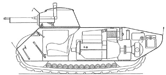 Projet des années 30 d'un char rapide qui resta au stade de l'esquisse. Il devait dirigé par un seul homme et avoir un poids d'environ 3t. La tourelle était montée très en avant et le moteur occupait la partie arrière de la caisse. La queue de franchissement faisait partie intégrante du char. Le blindage de devait pas être très important et l'armement devait être vraisemblablement une mitrailleuse. La transmission et les barbotins étaient à l'arrière et le train de route comprenait 13 petits galets de chaque côté. Project of the Thirties of a fast tank which remained at the stage of the draft. It had directed by only one man and to have a weight of approximately 3t. The turret was assembled very ahead and the engine occupied the back part of the hull. The tail of crossing was integral part of the tank. The shielding was not to be very important and the armament was to be probably a machine-gun. The transmission and the sprocket-wheels were in the back and the running-gear included 13 small road-wheels on each side.
