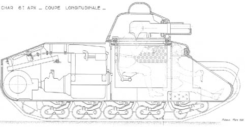 Le char de 6t APX s'inscrivait dans un programme de chars léger d'accompagnement de l'Infanterie émis en 1933. Ce char qui était en gros une version alourdie et agrandie du char Somua S-35, vit le jour en 1934. Il ne fut cependant pas retenu. L'équipage était de 2 hommes. Ce char d'environ 6 à 7t devait en principe être armé d'un canon de 37mm SA18 et d'une mitrailleuse coaxiale de 7.5mm dans une tourelle moulée. Il devait mesurer en longueur 4.73m. La coque était moulée et de forme simple avec un blindage de 20mm environ. Chaque train de route comprenait 11 galets (5 bogies de 2 et 1 solitaire) et 4 rouleaux porteurs. Les barbotins étaient disposés à l'arrière. The tank of 6t APX fell under a program of light tanks of Infantry emitted in 1933. This tank which was wholesale a weighed down and increased version of tank Somua S-35, was born in 1934. It was however not retained. The crew was of 2 men. This tank of approximately 6-7t was to be armed in theory with a gun of 37mm SA18 and a coaxial machine-gun of 7.5mm in a cast turret. It was to measure in length 4.73m. The hull was cast and of simple form with a shielding of 20mm approximately. Each running-gear included 11 road-wheels (5 bogies of 2 and 1 independent) and 4 return rollers. The sprocket-wheels were laid out in the back.