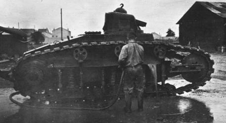 Ce char Renault FT armé d'une mitrailleuse Hotchkiss de 8 mm ne sera jamais vraiment modifié au cours de son service dans l'entre-deux-guerre. En 1931, en guise de modernisation, la mitrailleuse Hotchkiss sera remplacée par une mitrailleuse Reibel de 7.5 mm. Cependant ces chars sont usés par des années de service et leur état mécanique n'est guère brillant. Lors de l'invasion allemande il reste environ 1400 chars plus ou moins opérationnel (dont les modèles armés d'un canon). Ces chars obsolètes ne purent rien faire pour contrer les chars allemands plus modernes. This Renault FT tank armed with a 8 mm Hotchkiss machine gun will never really be changed during its service in the inter-wars. In 1931, as only modernization, the Hotchkiss machine gun will be replaced with a 7.5 mm Reibel machine gun. However these tanks are worn by years of service and their mechanical condition is hardly bright. During the German invasion there approximately 1400 more or less operational tanks (including models with guns). These obsolete tanks could not do anything to counter the most modern German tanks.