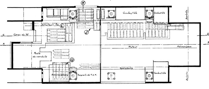 Le moteur Renault 6 cylindres d'aviation était équipé d'un démarreur électrique et d'un dispositif à air comprimé. L'ensemble boîte de vitesses-transmission était relié directement au réducteur,et transmettait la puissance du moteur aux barbotins via des différentiels auxiliaires dirigés par le système hydrostatique Naeder (pour la direction). Ce système très sophistiquée permettait de très précis changements de direction, indispensables pour le pointage du canon de 75 mm. Les freins à tambour à servo-frein (bandages à sec) installés sur les différentiels auxiliaires intervenaient également dans les changements de direction. The Renault 6 cylinders engine of aviation was equipped with an electric starter and a compressed-air device. The gearbox-transmission unit was connected directly to the reducer, and transmitted the output of the engine to the sprocket-wheels via auxiliary differentials directed by the hydrostatic system Naeder (for the steering). This system very sophisticated allowed very precise changes of direction, essential for the pointing of the gun of 75 mm. The drum-brakes with servo-brake (dry bindings) installed on the auxiliary differentials also intervened in the changes of direction.