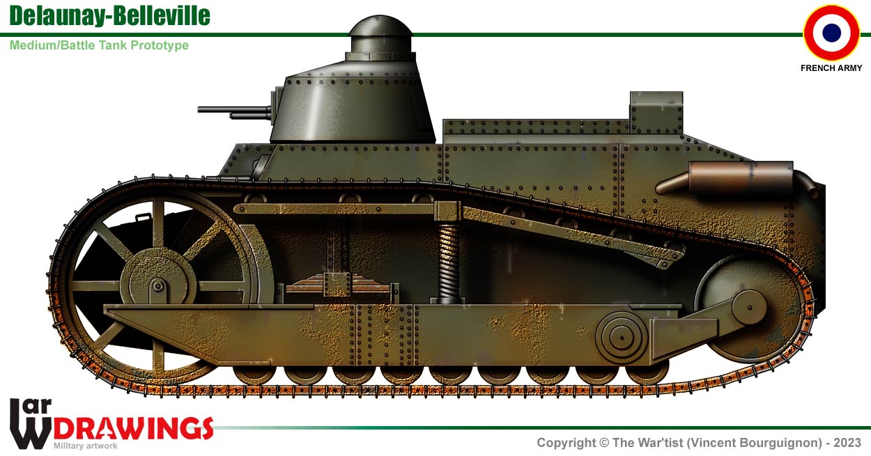 The General Estienne launched in 1921 a study of the future battle tank and called on the manufacturers who have already participated in the production of tanks during the conflict that has just ended. Five prototypes were presented in 1924: SRA, FCM 21, Famh, Delaunay-Belleville and SRB or Renault-Schneider Type B None of these prototypes will be adopted. The Delaunay-Belleville (a reinforced and lenghtened Renault FT) did not respond to the program specifications and was quickly abandoned. However, the experience acquired makes it possible to define the specifications of the future tank B and these devices are at the origin of the Dual tank, a concept which will be followed until the beginning of the Second World War. |