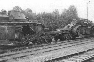 Lors du début de l'offensive allemande, le 10 mai 1940, le 51ème BCC se trouve dans les bois au nord de Briey. Les chars 2C y resteront jusqu'au 12 juin. Lors du repli, 2 chars furent perdus pour cause de pannes et sabotés, le reste rejoindra son point d'embarquement (à Landres) par route, mais surprise, pas de locomotives ! Les deux convois ne seront prêts au départ que le lendemain en fin de matinée. Le 15 juin, les deux convois furent bloqués dans une courbe en avec déblais par un autre convoi en flamme. Le commandant Fournet ne pouvant débarquer ses chars, donna l'ordre de saborder pour éviter leur capture par les Allemands. Les hommes du Panzer-Regiment 10 découvriront cependant un exemplaire encore en état de marche, dont les charges avaient oublié d'exploser. En résumé, le char lourd 2C était né trop tard ou trop tôt. Trop tard pour jouer le moindre rôle dans la "Grande Guerre", où il aurait été une révolution au niveau technologique et puissance de feu. Trop tôt pour jouer un rôle important dans la 2ème guerre mondiale, car son design conçu à la fin de la guerre 14-18, était complètement obsolète aux vues des normes de 1940. Ce char était totalement inapte à la guerre de mouvement imposée par les Allemands en raison de sa lenteur, de sa faible mobilité, de son transport mal aisé. At the time of the beginning of the German offensive, May 10, 1940, 51th BCC is in wood in the north of Briey. The tanks 2C will remain there until June 12. At the time of the french recoil, 2 tanks were lost due to breakdowns and were sabotaged, the remainder will join its point of loading (in Landres) per road, but surprised, not locomotives! The two convoys will be ready to leave only the following day at the end of the morning. June 15, the two convoys were blocked in a curve with cuts by another convoy in flame. The commander Fournet which cannot unload his tanks, gave the order to scuttle to avoid their capture by the Germans. The men of Panzer-Regiment 10 will however discover a specimen still in operating state, whose loads had forgotten to explode. In short, the heavy tank 2C had been born too late or too early. Too late to play the least part in the "Great War", where it would have been a revolution at the technological and fire power level. Too early to play an important part in the 2nd world war, because its design conceived at the end of war 14-18, was completely obsolete in regards of the standards of 1940. This tank was completely inapt for the mobile warfare imposed by the Germans because of its slowness, its low mobility, its badly easy transport.