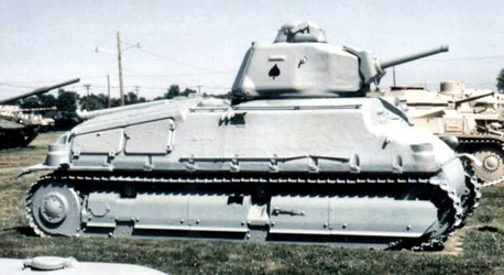 Le compartiment de combat était séparée du compartiment-moteur par une cloison pare-feu. Directement derrière cette cloison on trouvait le réservoir d'essence auto-étanche (à droite) et le moteur, un Somua 8 cylindres en V, de 190 ch, ainsi que la transmission dotée d'un système de direction à deux différentiel. Ce dernier était commandé grâce à des embrayages bi-disques à sec, via des câbles reliés au volant de direction. Celui-ci au moyen d'un système de trains épicycloïdaux, faisait virer le char en ralentissant le mouvement de l'une des deux chenilles et en augmentant celui de l'autre, sans diminuer (ou presque) la vitesse du char. La suspension était composée de chaque côté de 2 groupes de 4 galets et d'un galet arrière indépendant. Le bord intérieur de ces galets en acier, faisait une saillie qui courrait dans le creux d'un sillon pratiquée dans la chenille. Ce système supprimait les dents-guide tout en évitant le déchenillage. Les deux rouleaux porteurs présents de chaque côté étaient conçus de la même manière que les galets. Avec deux patins supports munis d'un guide, ces rouleaux porteurs supportaient la partie supérieure de la chenille, la guidant vers la poulie de tension à l'avant du char. Les patins originaux de 360 mm de large seront remplacés plus tard par des patins plus larges de 75 à 105 mm. The compartment of combat was separated from the engine-compartment by a firewall. Directly behind this wall one found the self-sealing gasoline tank (on the right) and the engine, Somua 8 cylinders in V, of 190 hp, as well as the transmission equipped with a steering system with two differential. This last was commanded thanks to dry two-plate clutches, via cables connected to the steering wheel. This one by means of a system of epicyclic gears, made turn the tank by slowing down the movement of one of the two tracks and by increasing that of the other, without decreasing (or almost) the speed of the tank. The suspension was made up on each side of 2 groups of 4 road-wheels and an independent rear road-wheel. The interior edge of these steel road-wheels, stand out which would run in the hollow of a furrow practised in the track. This system removed the tooth-guide while avoiding the trackloss. The two return rollers present on each side were designed same manner as the road-wheels. With two support links provided with a guide, these return rollers supported the higher part of the track, guiding it towards the front idler. The 360 mm broad original links will be replaced later by links broader from 75 to 105 mm.