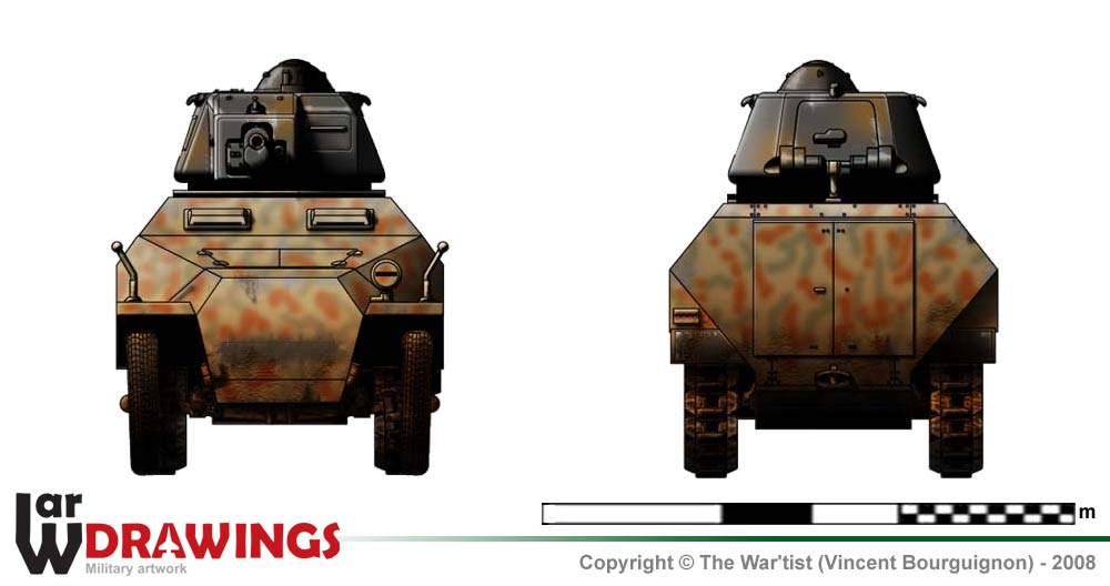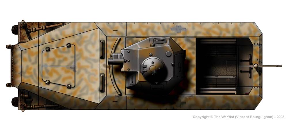 1945. Subsequently captured and reused by French troops, with a French flag painted on the side of the vehicle and the Balkenkreuz brushed. |