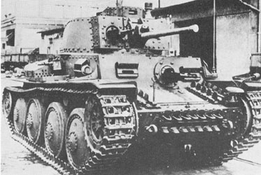 Panzerkampfwagen 38(t) Light Tank Il s'agit du véhicule originale en service dans l'armée tchèque et capturé par la Wehrmacht. 150 furent produits de mai à novembre 1939 (châssis nos. 0001-0150). 59 exemplaires serviront au sein du 67e Panzerabteilung de la 3e Leichte Division en Pologne. 15 autres seront envoyés en Norvège. Ce modèle sera utilisé sur tous les fronts sauf en Afrique. It is about the original vehicle in service in the Czech army and captured by Wehrmacht. 150 were produced from May to November 1939 (chassis 0001-0150). 59 specimens will be useful within the 67th Panzerabteilung of 3rd Leichte Division in Poland. 15 others will be sent in Norway. This model will be used on all fronts safe in Africa.