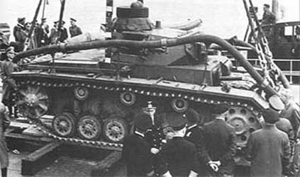 Panzerkampfwagen III Medium Tank Conversions: Tauchpanzer III Le char submersible Tauchpanzer III fut conçu tout spécialement pour l' opération Zeelöwe (Lion de mer), l' invasion de l' Angleterre. Au total, 168 Panzers III Ausf.F (37 mm et 50 mm KwK), Ausf.G et Ausf.H ainsi que quelques Pz.BfWg III furent convertis, les derniers le furent fin 1940. Les chars ainsi convertis furent versés dans le Panzerabteilung A, unité spéciale mise sur pieds à Putlos au nord de l' Allemagne. Le Tauchpanzer III fut conçu pour se mouvoir sous 15 m d' eau et ainsi pouvoir approcher sans être repérés les plages défendues par l' ennemi. Sur le Tauchpanzer III toutes les ouvertures furent rendues étanches ou scellées. Les échappements furent équipés d' un système permettant aux gaz de sortir mais empêchant tout autre élément d' y pénétrer. Un tube de caoutchouc fut installé entre la tourelle et la caisse. Les orifices des canons et mitrailleuses étaient obturés par des couvercles en caoutchouc (notons que ces couvercles pouvaient être enlevés de l' intérieur lorsque le char regagnait la terre, ce qui est bien utile). The submersible tank Tauchpanzer III was designed in particular for the operation Zeelöwe (Sea lion), the invasion of England. On the whole, 168 Panzers III Ausf.F (37 mm and 50 mm KwK), Ausf.G and Ausf.H as some Pz.BfWg III were converted, the last were to it at the end of 1940. The tanks thus converted were versed in Panzerabteilung A, special unit created in Putlos in the north of Germany. Tauchpanzer III was conceived to be driven under 15 m of water and thus to be able to approach without to be located the beaches defended by the enemy. On Tauchpanzer III all the openings were made tight or sealed. The exhausts were equipped with a system making it possible gases to leave but preventing any other element to penetrate there. A rubber tube was installed between the turret and the hull. The openings of the guns and machine-guns were sealed by rubber covers (let us note that these covers could be removed from interior when the tank regained the ground, which is quite useful).