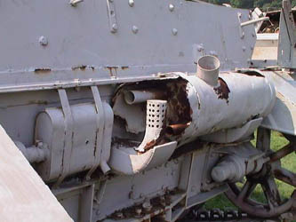 L'Ausf.H voit également l'adoption de la pâte anti-magnétique Zimmerit appliquée sur les parois verticales. Le sabord de vision frontal du chargeur est supprimé à l'avant de la tourelle. De nouveaux barbotins plus légers sont également adoptés. Certains modèles seront équipés de rouleaux porteurs tout acier et de nouvelles poulies de tension de chenille (moulées). Le seul point qui permet de reconnaître à coup sure l'Ausf.H de l'Ausf.J est l'absence sur ce dernier du silencieux en forme de boîte du moteur auxiliaire (rotation de la tourelle) présent sur la gauche de la plaque arrière de la caisse. Ausf.H also sees the adoption of the Zimmerit antimagnetic paste applied to the vertical walls. The frontal port of vision of the loader is removed in front of the turret. New lighter sprocket-wheels are also adopted. Certain models will be equipped with any steel return rollers and new rear idlers (moulded). The only point which makes it possible to recognize with all the blows Ausf.H and Ausf.J, is the absence on this last of the silencer in the shape of box of the auxiliary engine (rotation of the turret) present on the left of the back plate.